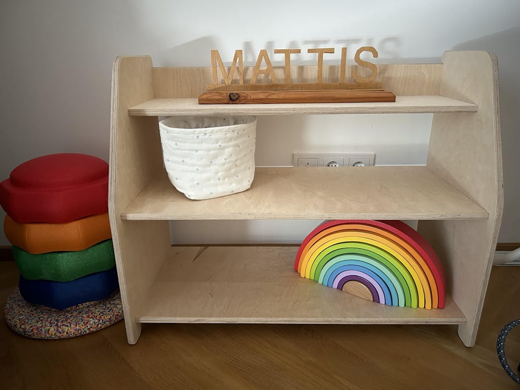 Et barn, der leger selvstændigt og hygger sig i lang tid med sin leg... Det er noget af det smukkeste! Og det er muligt med vores trælegebord! Hylderne er velegnede til opbevaring af legetøj, men disse legetøjshylder er lavet i småbørns-/førskolehøjde. Dette blev gjort bevidst, så børnene bliver udfordret til at lege og selv kan gribe legetøjet.