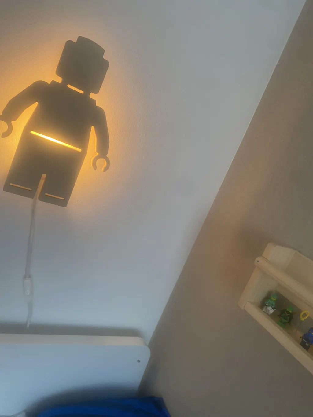 Der er et monteringsbeslag på bagsiden af natlampen. Du kan nemt selv fastgøre lampen til væggen ved først at fjerne beslaget fra figuren og derefter fastgøre den til væggen med 2 skruer (medfølger). Placer derefter figuren på beslaget.